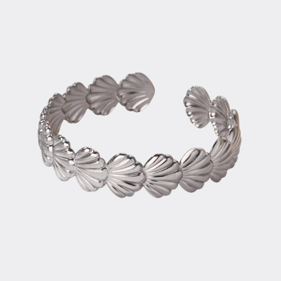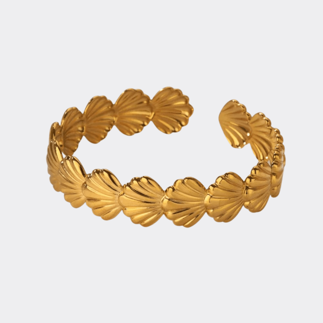 Dompel jezelf onder in een vleugje kustluxe met de Ariel Shell Bangle een elegante gouden armband geïnspireerd op de schoonheid van zee en strand. De gedetailleerde schelpvormen symboliseren vrouwelijke kracht, natuurlijke schoonheid en rust. Deze lichtgewicht bangle is open aan de achterkant voor een flexibele pasvorm en voelt comfortabel aan om je pols perfect voor zonnige dagen, strandvakanties of gewoon om een zomerse flair aan je dagelijkse outfit te geven.