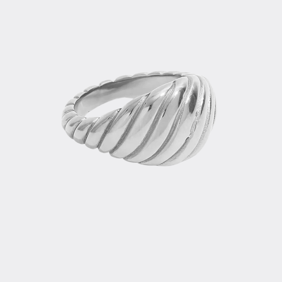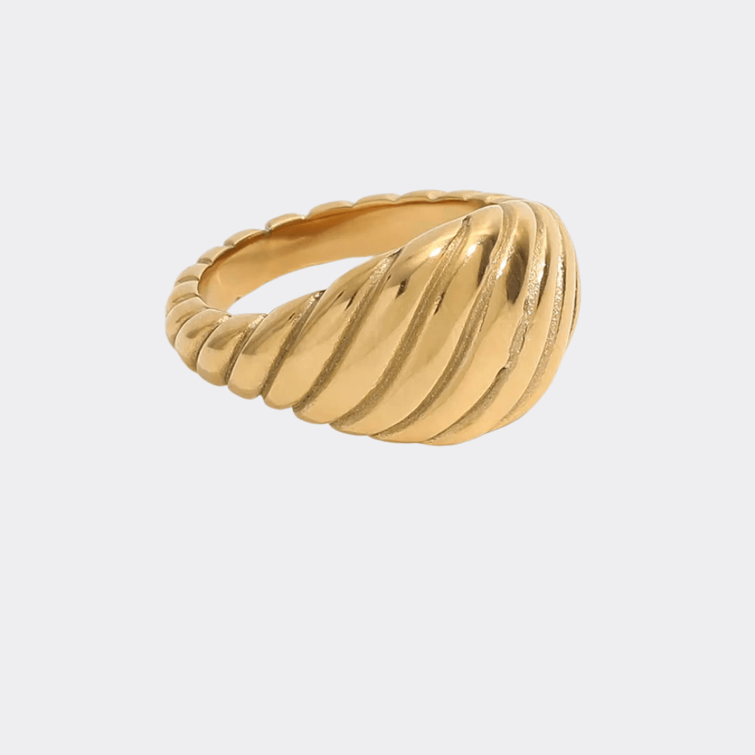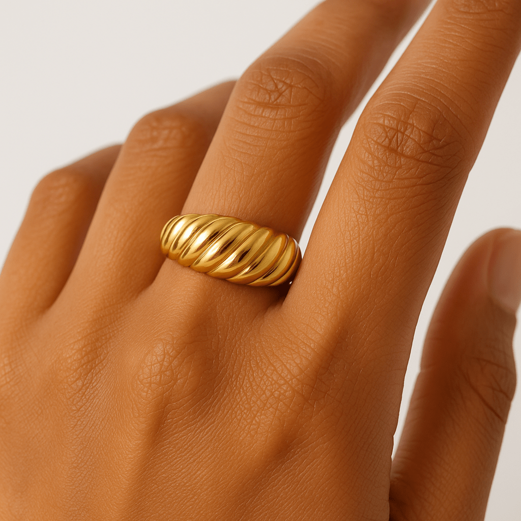 De Aurelia Ring is een verfijnd en stijlvol sieraad dat klassieke elegantie combineert met een moderne twist. Het tijdloze ontwerp wordt gekenmerkt door een subtiel golvend reliëf dat doet denken aan zachte, vloeiende lijnen, waardoor de ring een luxueuze uitstraling krijgt. Vervaardigd uit hoogwaardig roestvrij staal en afgewerkt met een duurzame 18K goudlaag, behoudt de Aurelia Ring zijn glans en kleur, zelfs bij dagelijks gebruik. Dankzij het lichtgewicht ontwerp en de comfortabele pasvorm is deze ring ideaal om de hele dag te dragen, of het nu gaat om een speciale gelegenheid of een casual look. De Aurelia Ring is ook verkrijgbaar in een elegante zilveren uitvoering, perfect voor liefhebbers van een meer minimalistische, koele uitstraling. Of je nu kiest voor de warme glans van goud of de verfijnde helderheid van zilver, dit sieraad voegt moeiteloos een vleugje klasse toe aan elke outfit. Combineer hem met andere ringen voor een trendy gelaagde look of draag hem solo voor een minimalistisch statement.