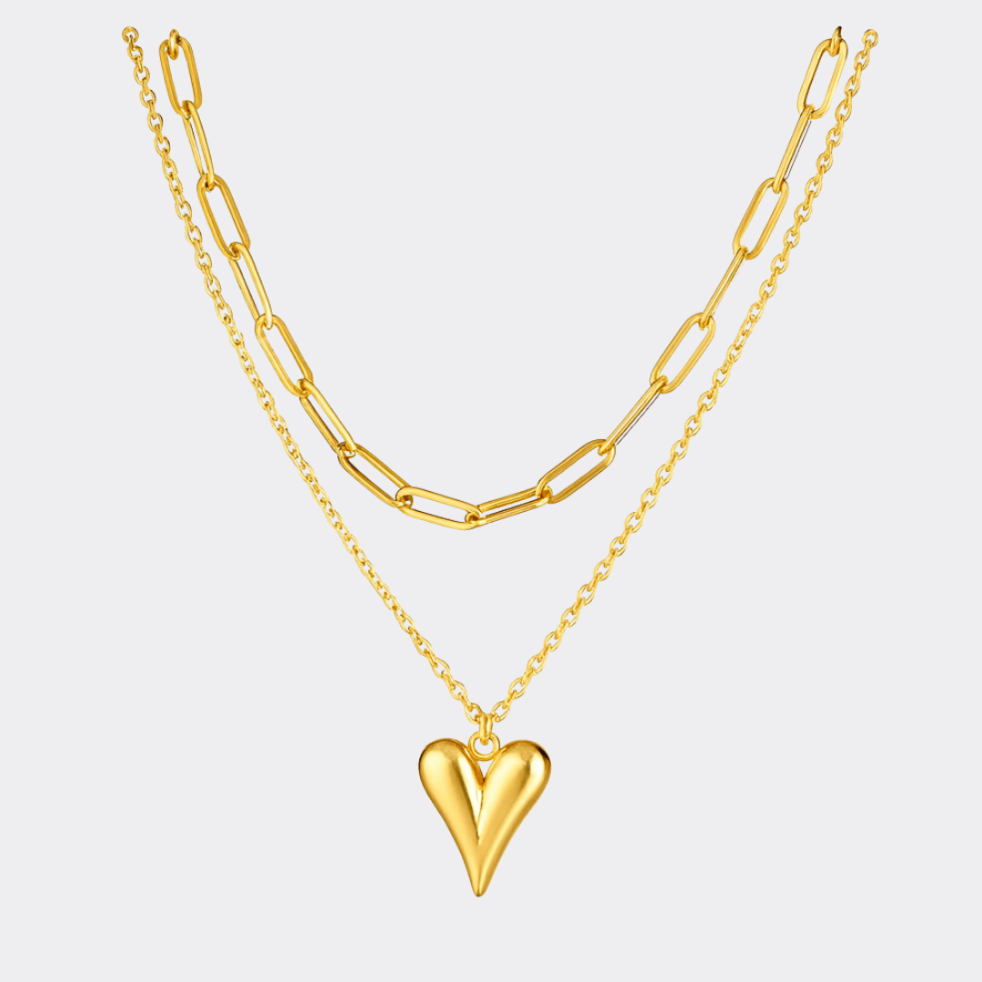 Voeg een vleugje elegantie en romantiek toe aan je look met de Aurora Hart Gelaagde Ketting in goud. Deze verfijnde ketting bestaat uit twee stijlvolle lagen: een grove paperclip schakel en een fijne ketting met een opvallend hartvormig hangertje. Gemaakt van hoogwaardig roestvrij staal en voorzien van een duurzame goudkleurige plating, is deze ketting zowel modieus als slijtvast. Dankzij het tijdloze ontwerp is de ketting perfect te combineren met elke outfit, of je nu kiest voor een casual look of een elegante avondstijl. De hartvormige hanger symboliseert liefde en zelfvertrouwen, waardoor dit sieraad ook een betekenisvol cadeau is voor een geliefde of voor jezelf. De Aurora ketting is licht van gewicht, nikkelvrij en comfortabel om de hele dag te dragen. Of je het nu solo draagt of combineert met andere kettingen voor een trendy layered look, dit accessoire is een absolute must-have in je sieradencollectie. Shop nu en laat je stijl stralen met deze gouden eyecatcher. Geschikt voor dagelijks gebruik én speciale gelegenheden.