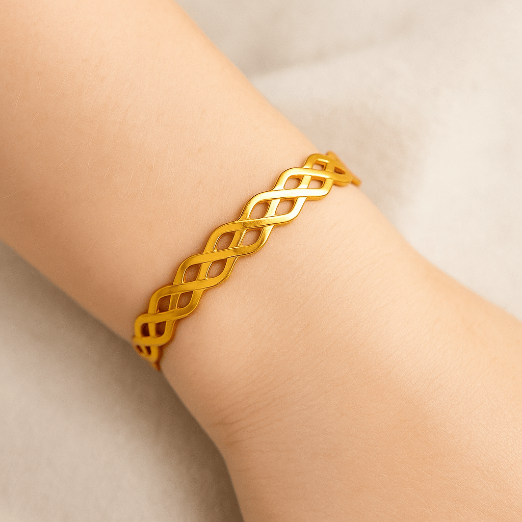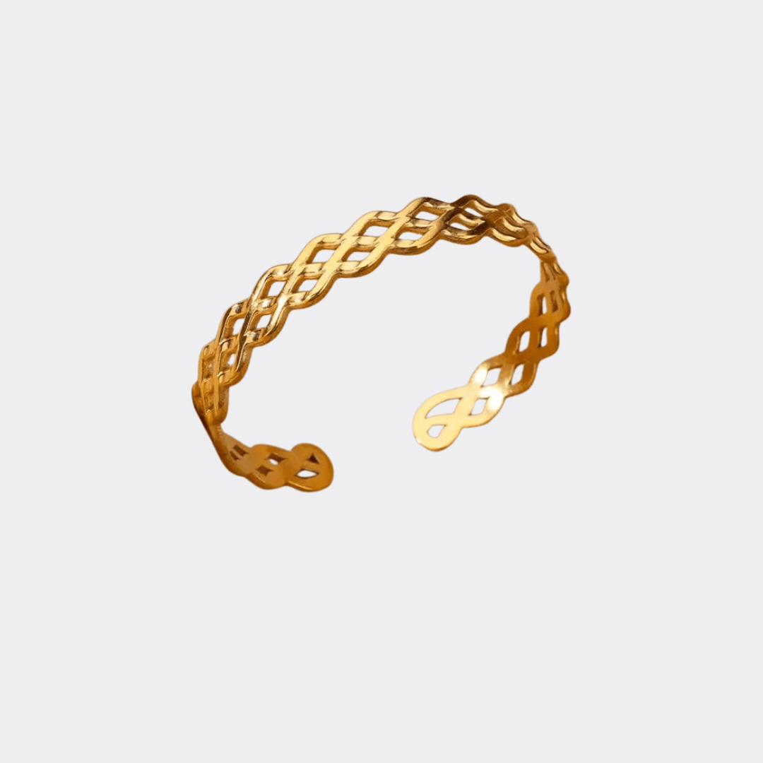 De Ava armband is een elegante en moderne armband met een verfijnd vlechtpatroon dat symbool staat voor verbondenheid en tijdloze stijl. Het open ontwerp en het lichte gewicht zorgen voor een comfortabele pasvorm rond de pols, terwijl de warme goudkleurige afwerking een subtiele luxe uitstraalt. De geometrische vormen vangen op een speelse manier het licht en geven elke beweging een sierlijke uitstraling. De Ava armband is perfect voor dagelijks gebruik, maar ook ideaal om een minimalistische look nét dat beetje extra te geven. Een stijlvol accessoire voor vrouwen die houden van eenvoud met karakter.