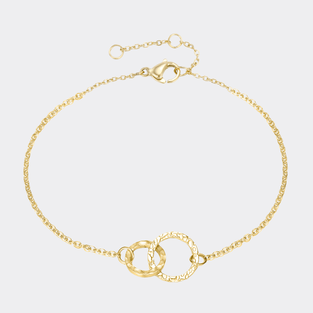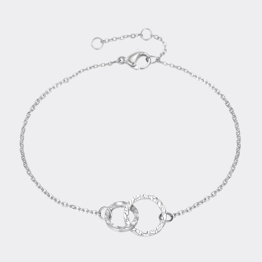 De Circa Bracelet is een subtiel en stijlvol accessoire dat tijdloze elegantie uitstraalt. Deze verfijnde armband is gemaakt van duurzaam roestvrij staal en is verkrijgbaar in twee klassieke kleuren: 14K goud en zilver. Het ontwerp bestaat uit twee in elkaar verweven cirkels met een gehamerde afwerking, wat symbool staat voor verbondenheid, balans en oneindigheid. De verstelbare lengte van 15 cm + 3 cm zorgt ervoor dat de armband comfortabel past om iedere pols. Dankzij het minimalistische en toch betekenisvolle design is de Circa Bracelet perfect om dagelijks te dragen, alleen of in combinatie met andere sieraden. Het roestvrijstalen materiaal is huidvriendelijk, waterbestendig en behoudt zijn glans langdurig, zelfs bij veelvuldig gebruik. Of je nu op zoek bent naar een cadeau met symboliek of een elegant detail voor je eigen sieradencollectie, deze armband is een tijdloze keuze die elke outfit compleet maakt. Voeg een vleugje finesse toe aan je look met de Circa Bracelet en draag het verhaal van verbinding met je mee, elke dag opnieuw.