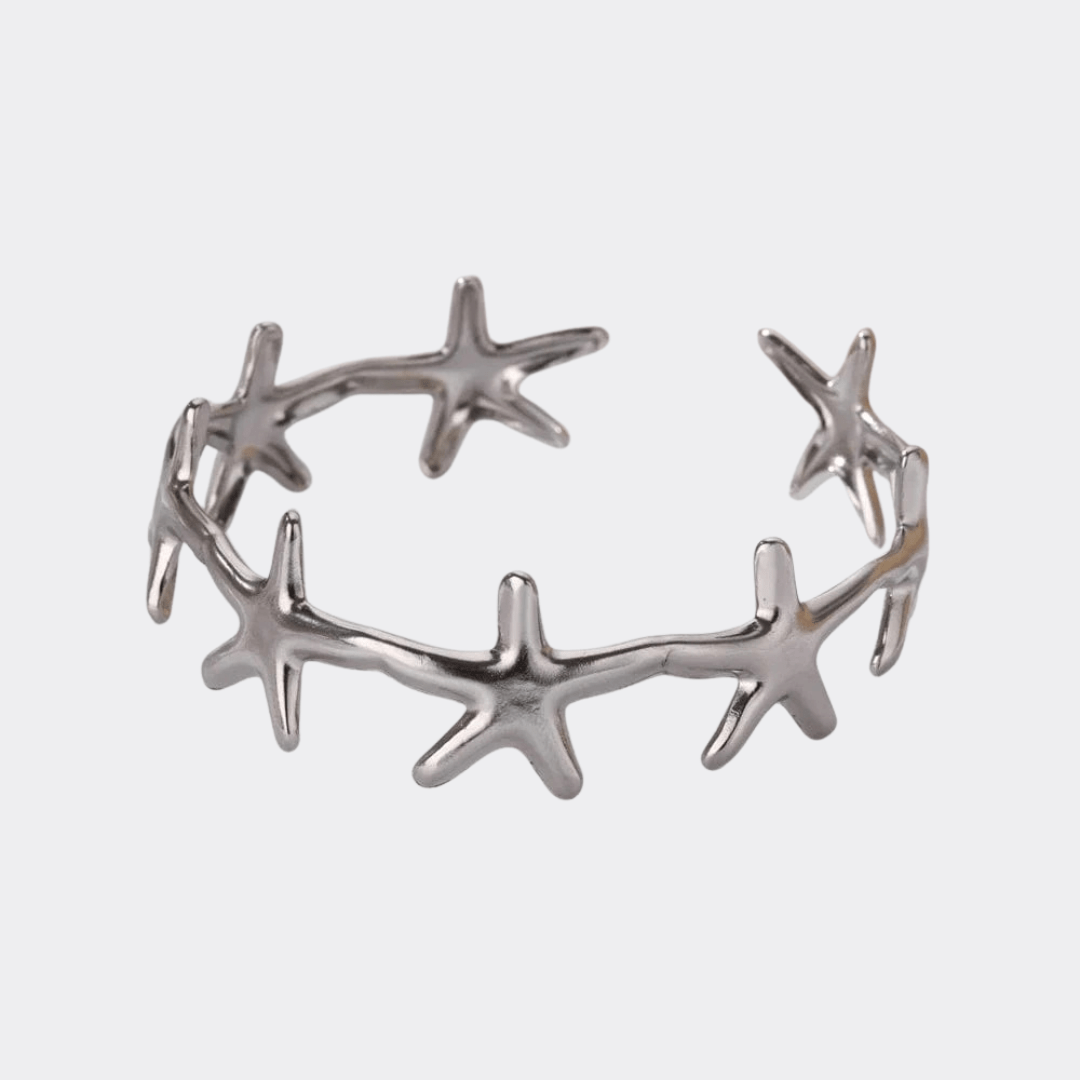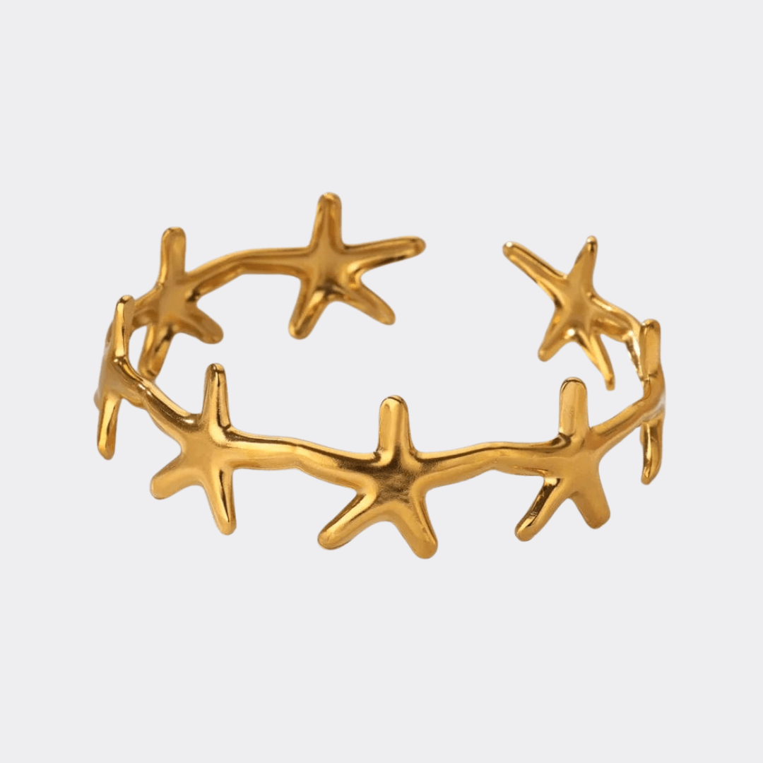Breng de magie van de zee naar je pols met de Isla Starfish Bangle een verfijnde gouden armband geïnspireerd op delicate zeesterren en tropische eilandmomenten. De open, verstelbare vorm zorgt voor een comfortabele pasvorm, terwijl het unieke ontwerp een speelse maar stijlvolle flair toevoegt aan elke zomerse outfit.