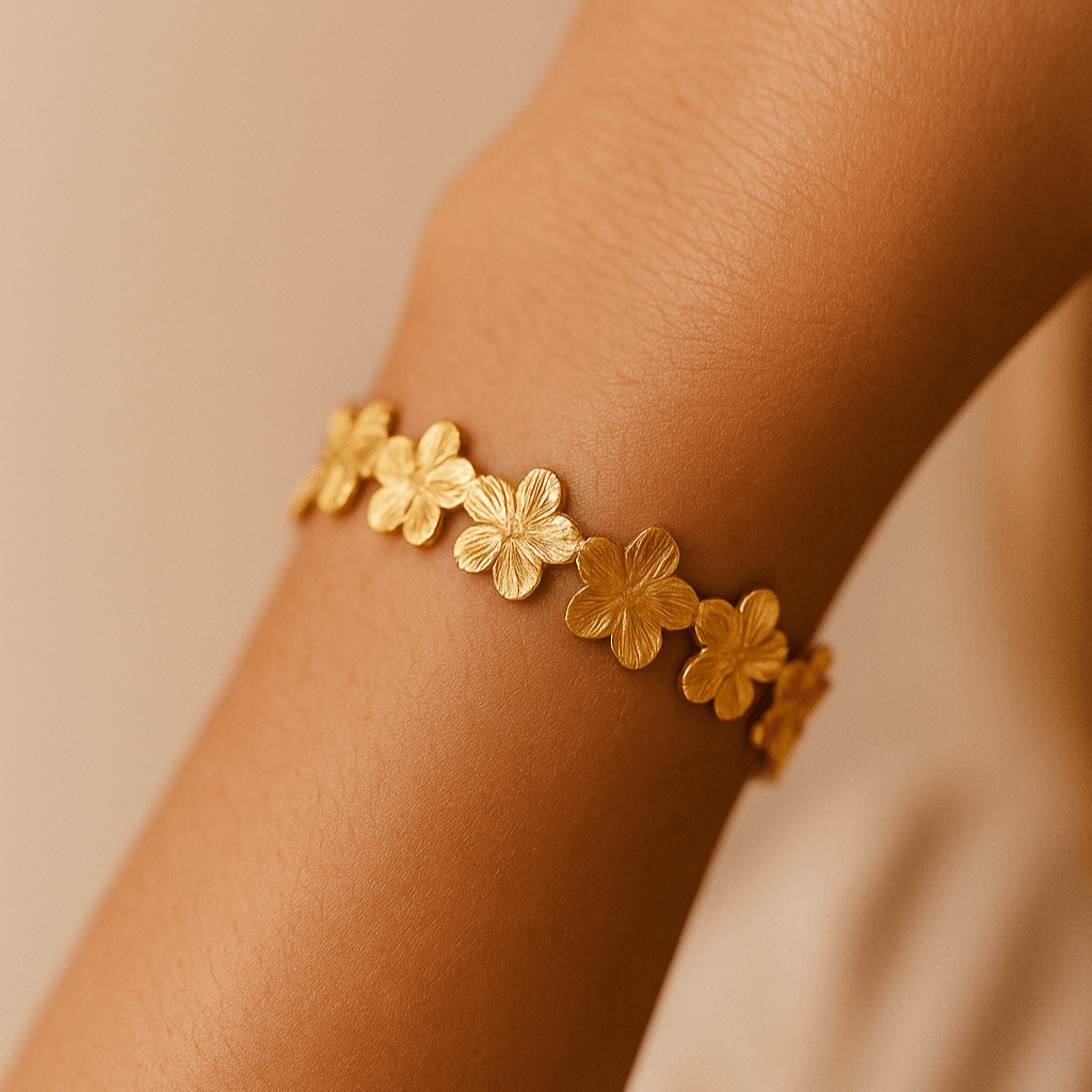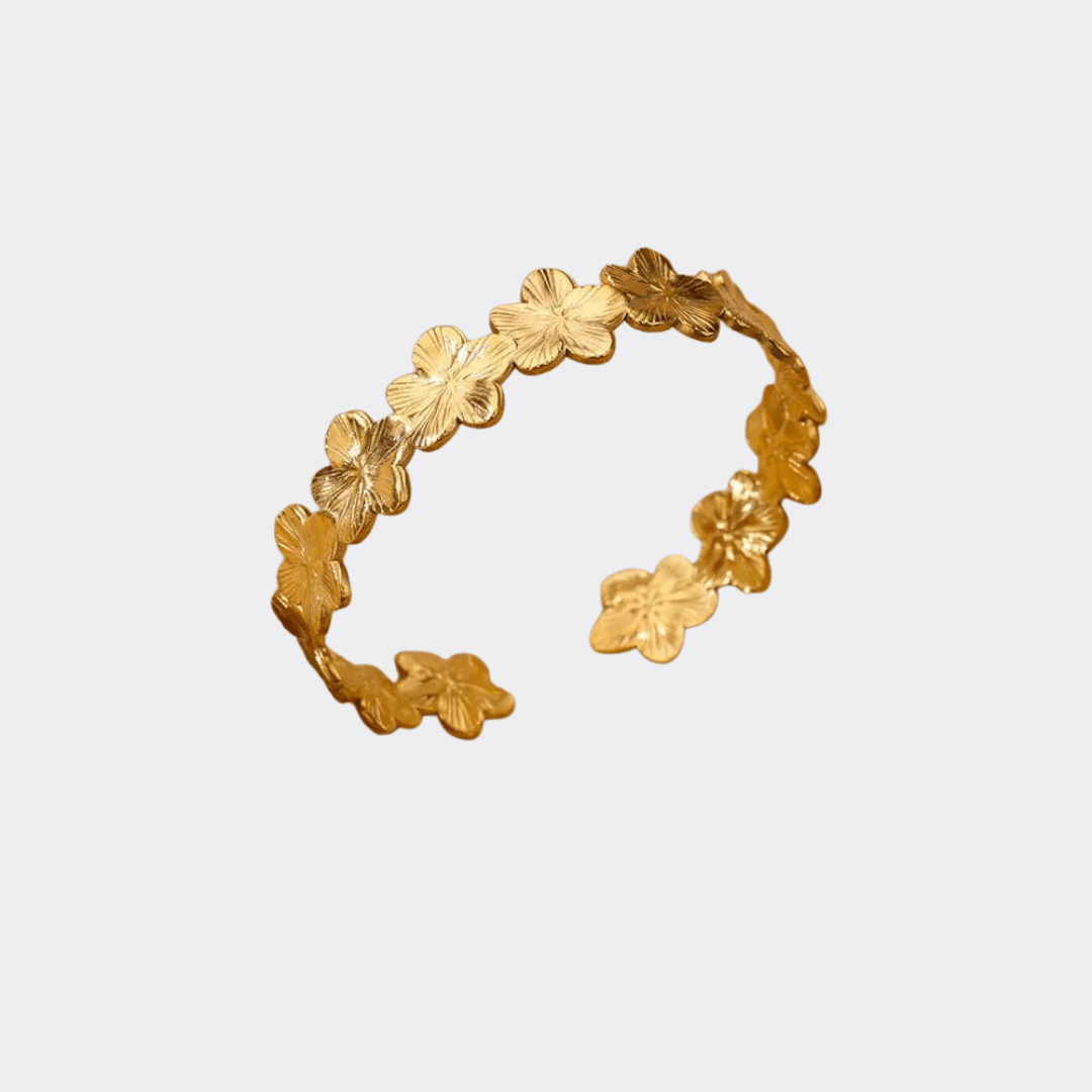 De Jasmine armband is een verfijnd en vrouwelijk accessoire dat direct in het oog springt door haar elegante bloemenontwerp. Met een reeks goudkleurige bloemetjes die naadloos in elkaar overlopen, straalt deze armband tijdloze charme en klasse uit. Het open ontwerp zorgt voor een comfortabele pasvorm om iedere pols, terwijl het lichte gewicht ervoor zorgt dat je de armband moeiteloos de hele dag kunt dragen. Perfect voor zowel dagelijks gebruik als speciale gelegenheden, maakt de Jasmine armband elke outfit compleet. Of je nu op zoek bent naar een subtiel statement piece of een betekenisvol cadeau, deze armband is de ideale keuze voor vrouwen die houden van stijl met een romantische touch.