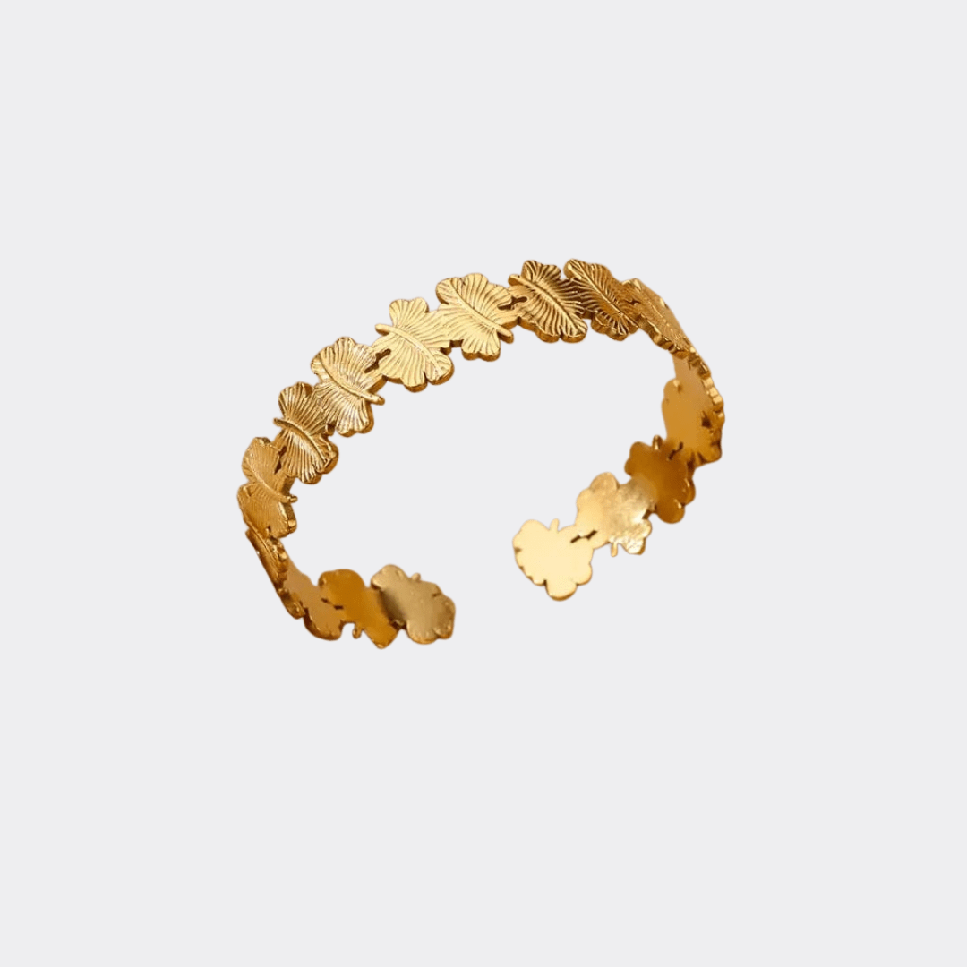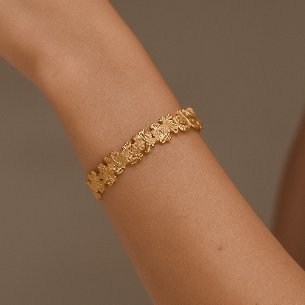 De Lexi armband is een verfijnd statement van natuurlijke elegantie. Met een uniek design van goudkleurige bladvormige elementen die naadloos in elkaar overvloeien, straalt deze armband een zachte, vrouwelijke charme uit. De gedetailleerde textuur van elk blaadje vangt het licht op subtiele wijze en zorgt voor een stijlvolle glans bij elke beweging. Dankzij het open ontwerp past de armband comfortabel om de pols en is hij zowel geschikt voor dagelijks gebruik als voor bijzondere gelegenheden. De Lexi armband is de perfecte keuze voor vrouwen die houden van sieraden met een verfijnde, organische uitstraling.