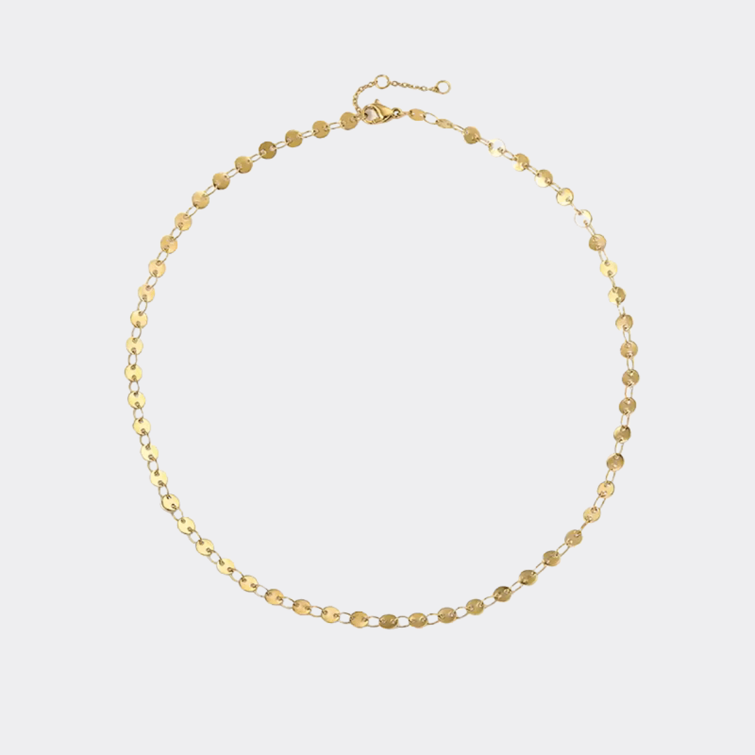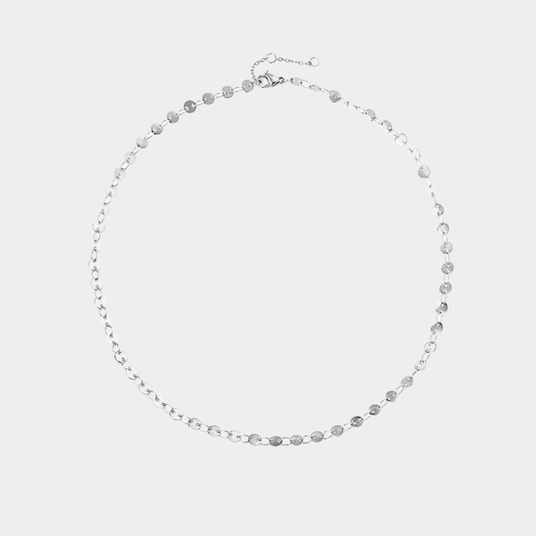 De Lumi Disc Choker is een modern en stijlvol sieraad dat elke outfit een verfijnde touch geeft. Deze ketting is vervaardigd uit hoogwaardig roestvrij staal en verkrijgbaar in zowel 14K goud als zilver. De ketting bestaat uit een reeks platte, glanzende discs die prachtig het licht reflecteren en zorgen voor een subtiele, maar opvallende uitstraling. Met een lengte van 35 cm plus een verlengstuk van 3 cm sluit deze choker perfect aan om de hals en is hij ideaal voor zowel een casual als elegante look. Het minimalistische ontwerp maakt de Lumi Disc Choker geschikt om solo te dragen, maar ook perfect te combineren met langere kettingen voor een trendy gelaagde stijl. Door de duurzame afwerking is de ketting bestand tegen dagelijks gebruik zonder te verkleuren. Kies de gouden variant voor een warme, klassieke uitstraling of ga voor zilver voor een frisse, moderne look. Welke kleur je ook kiest, de Lumi Disc Choker is een tijdloze toevoeging aan je sieradencollectie en een must-have voor wie houdt van subtiele luxe.